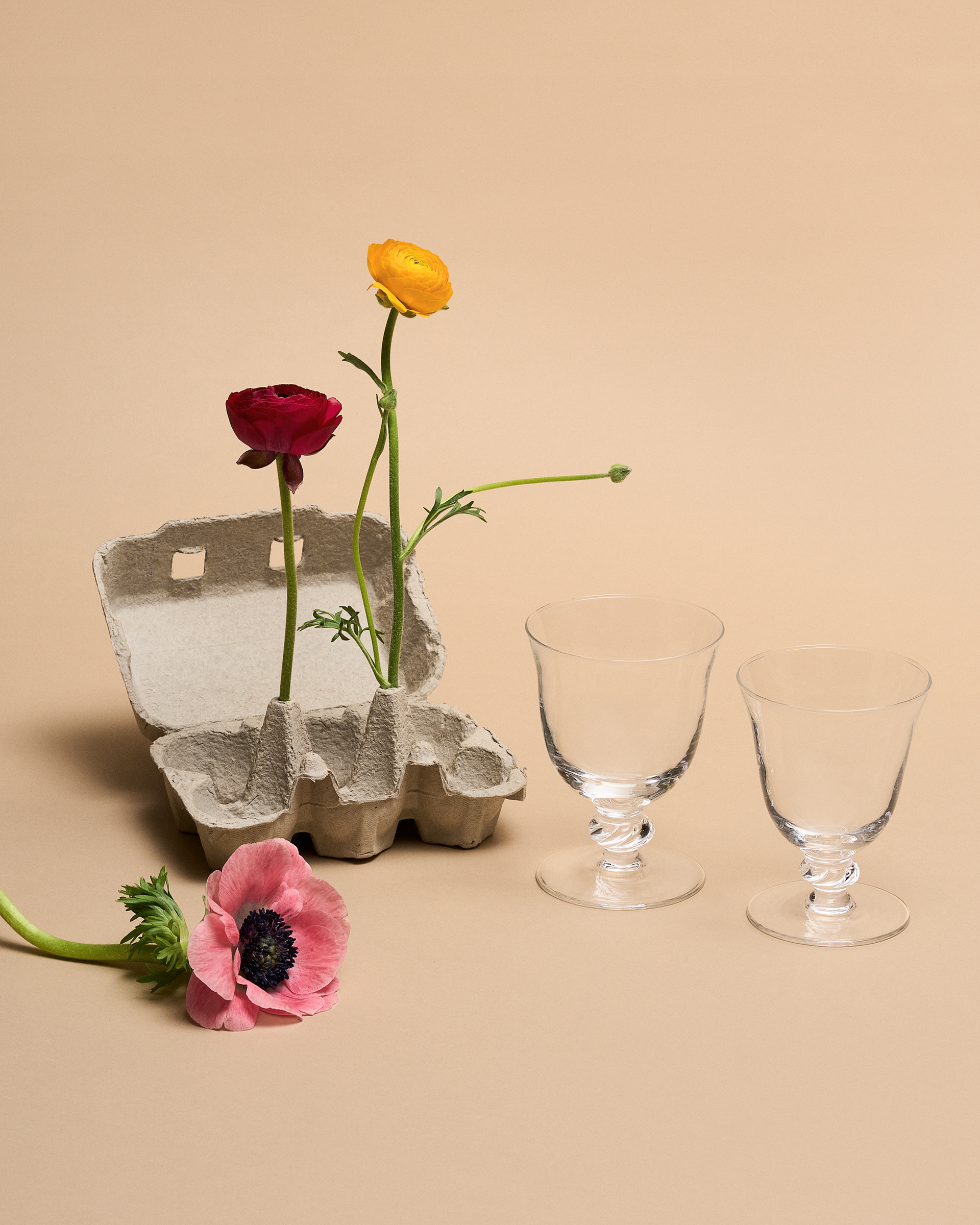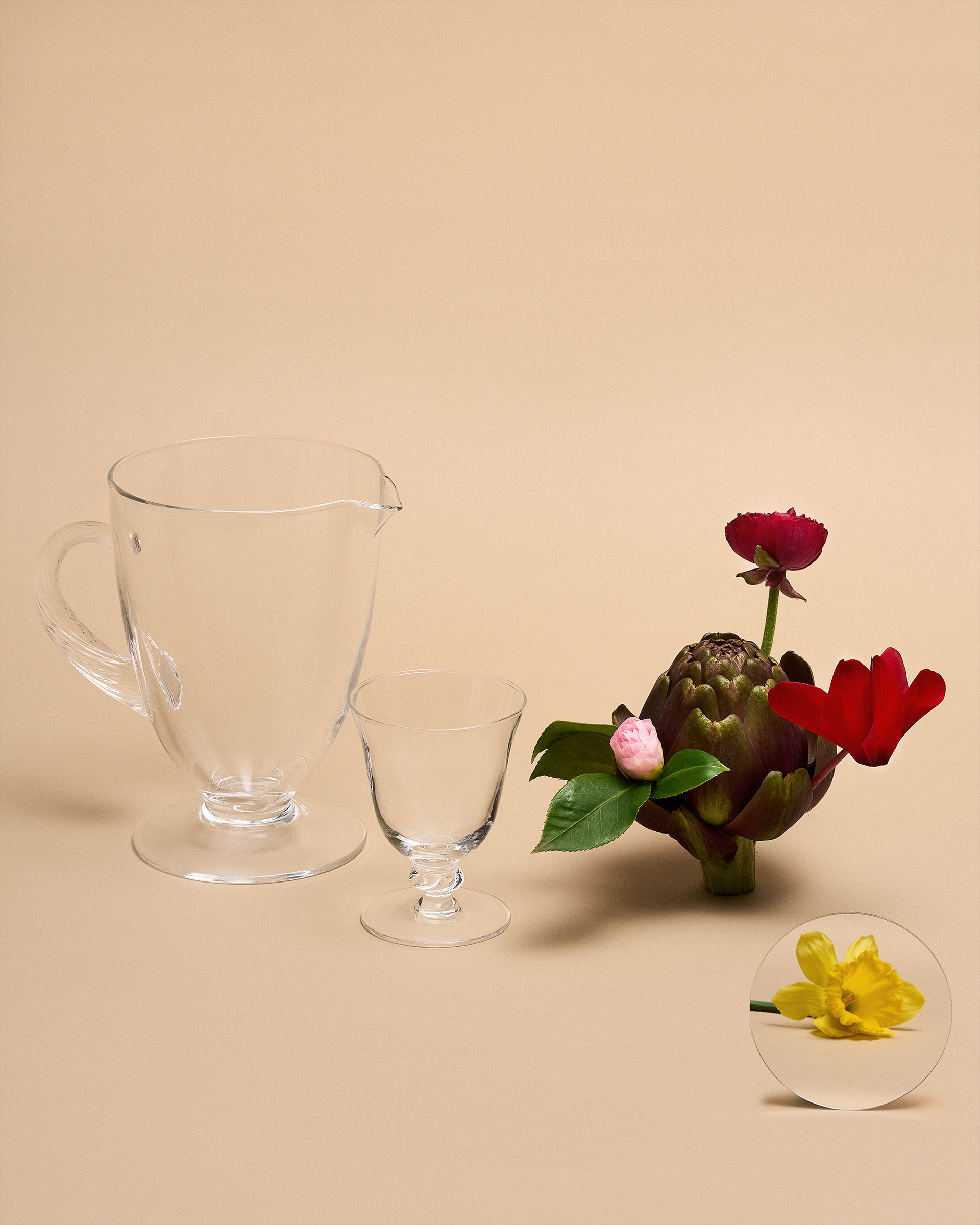 Attraverso l'utilizzo di una luce morbida e di un fondale dai toni caldi, si crea un'atmosfera serena e tranquilla. I fiori e gli altri oggetti di scena, pensati per contrastare cromaticamente con lo sfondo e la trasparenza degli oggetti, aggiungono un tocco di colore, contribuendo così a enfatizzare la delicatezza complessiva dell'immagine. La scelta di props come frutta, ortaggi e fiori primaverili di campo aiuta a collocare i prodotti direttamente sulle nostre tavole, rendendoli parte della nostra quotidianità e aggiungendo un tocco naturale e fresco.